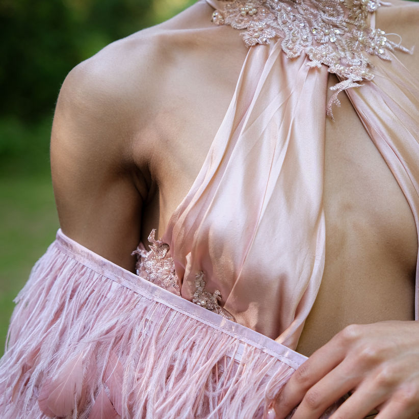 Featuring a delicately soft colour palette that symbolizes a gentler message of the dynamic color that represents Aries, while embracing the hues of fire flames. This soft color palette also symbolizes the beauty, harmony and calming energies of the Aries birthstones (Diamond and Aquamarine). With high necklines with soft long drapes is a nod to traditional catholic vestments. Reinvison for modernity, with sultry cuts and crystalline fabric manipulations and embroideries.